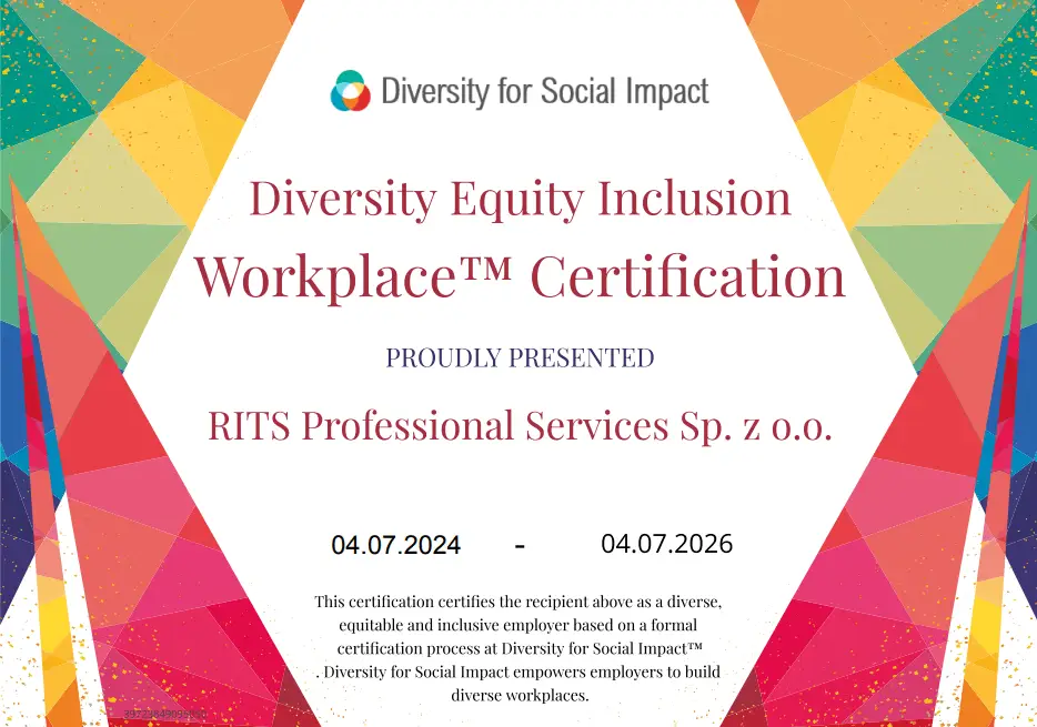 RITS strong commitment to fostering a diverse, equitable, and inclusive work environment is evidenced by The Diversity Equity Inclusion Workplace™ certification from Diversity for Social Impact™. After a thorough certification process, RITS was recognized for its diversity and inclusion across a wide range of diversity and inclusion dimensions. As one of the organizations forming the Association of Business Service Leaders (ABSL), RITS has also signed the Diversity & Inclusion Declaration, a joint commitment to be guided – in all activities – by the principle of equal treatment in the workplace.